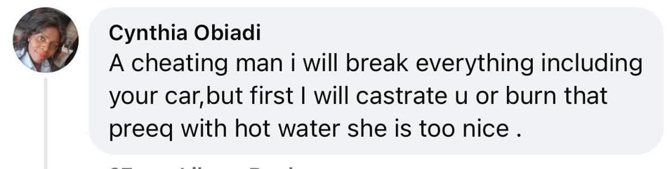 A Nigerian woman, Cynthia Obiadi, has revealed what she will do to her man if he ever cheats on her. Commenting on a Facebook post about the man who allegedly impregnated his wife’s maid, she wrote; A cheating man, I will break everything, including your car, but first I will castrate you or burn that preeq with hot water. She is too nice.