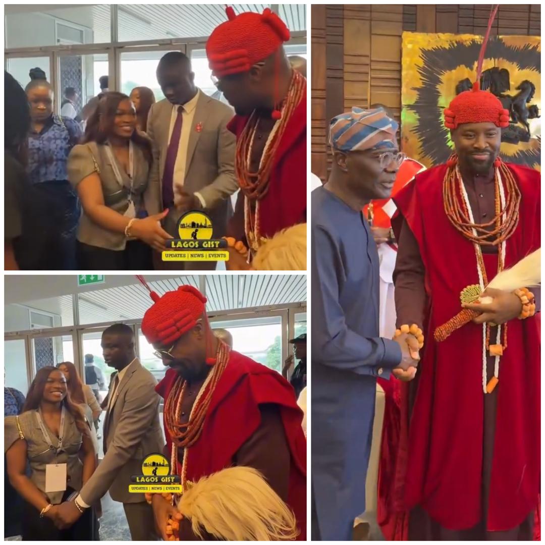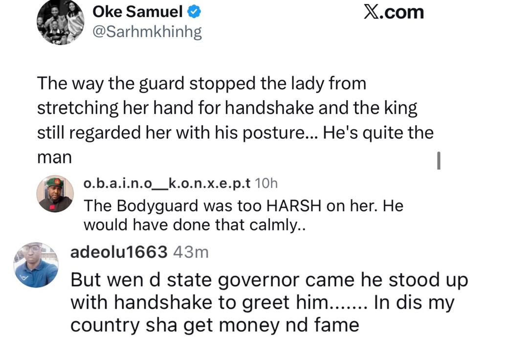 Nigerians on social media are reacting to a trending video showing the moment the security detail of the Olu of Warri stopped a lady from shaking him at an event. The monarch was in Lagos state on Tuesday, January 6, attending an event at the Wole Soyinka Center for Culture and Creative Arts. Just as he arrived at the venue, organizers of the event filed out to receive the king, After being received by some of the organizers, one of them went further by introducing the young lady as a member of their team. Immediately after her name was mentioned to the king, the young lady stepped forward and stretched her hand to shake the monarch, This was immediately stopped by the security detail of the monarch who immediately slapped her hand down. The king however went on to acknowledge her and greet her, howbeit he did not shake her nor initiate a handshake with her. The video has sparked a debate online. While some Nigerians berated the young lady for attempting to shake a monarch, others argued that there is no justification for stopping her to shake the monarch, They argued that if she was a person of importance, the security would not have stopped her from shaking the monarch. Some Nigerians also reacted to a video showing the monarch at the same event standing up to shake the Governor of Lagos state, Babajide Sanwo-Olu.