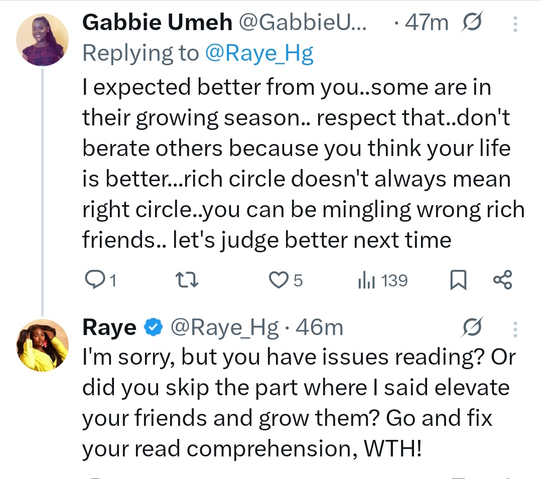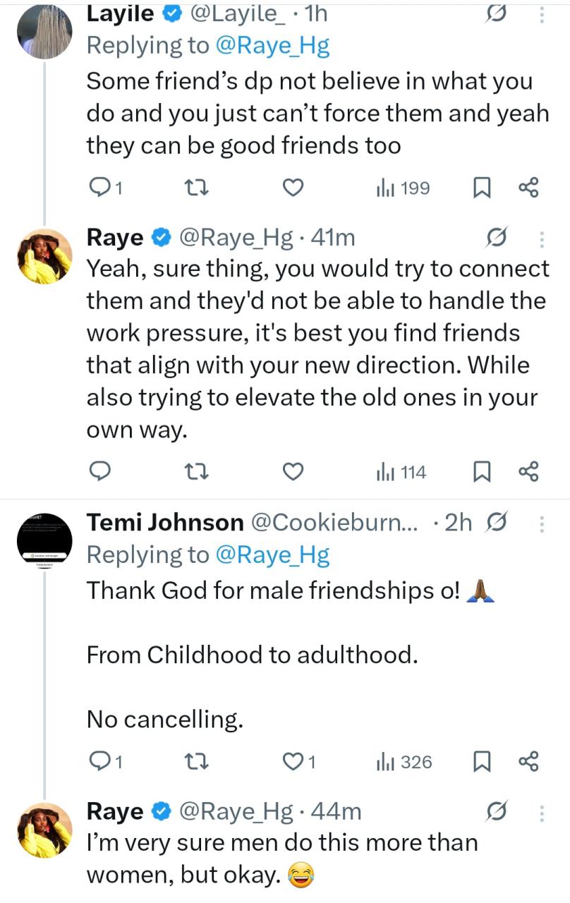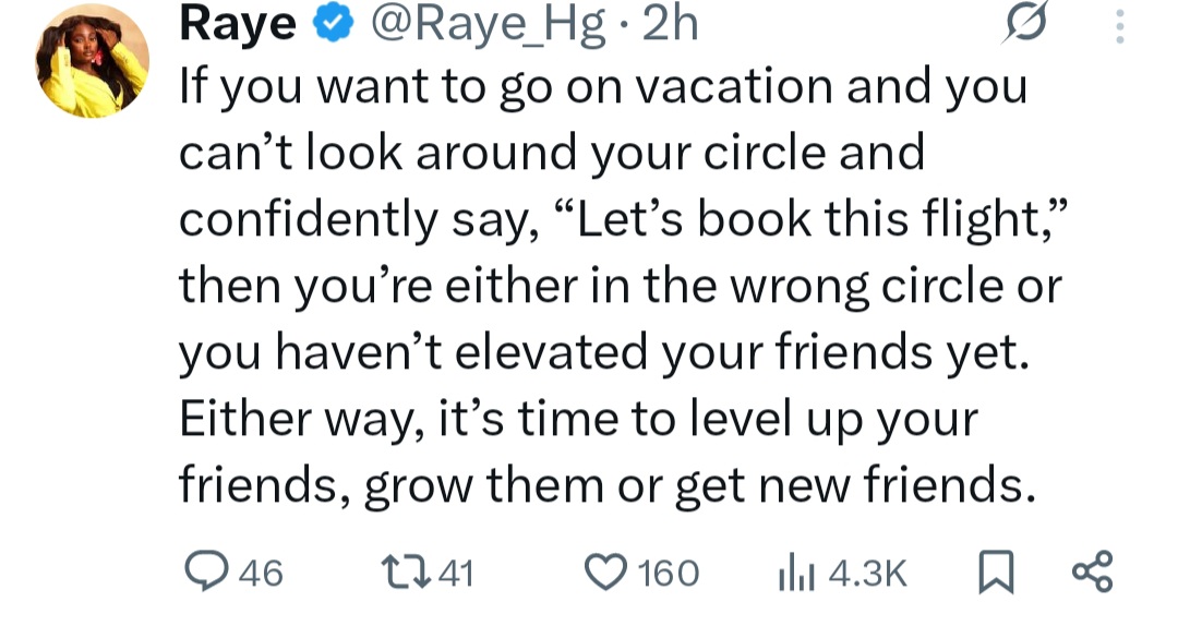 Ushie Rita Uguamaye, better known as Raye, has sparked debate over her thoughts on friendship. The influencer, who became a viral sensation when she criticized President Tinubu’s administration while she was a corps member, is trending for her recent opinion. She wrote on X: “If you want to go on vacation and you cant look around your circle and confidently say, Lets book this flight, then youre either in the wrong circle or you havent elevated your friends yet. Either way, its time to level up your friends, grow them or get new friends.” Her opinion was questioned by her followers but she stood her ground. When told that not every friend will be at the same level, she responded, “It’s best you find friends that align with your new direction. While also trying to elevate the old ones in your own way.” See below.