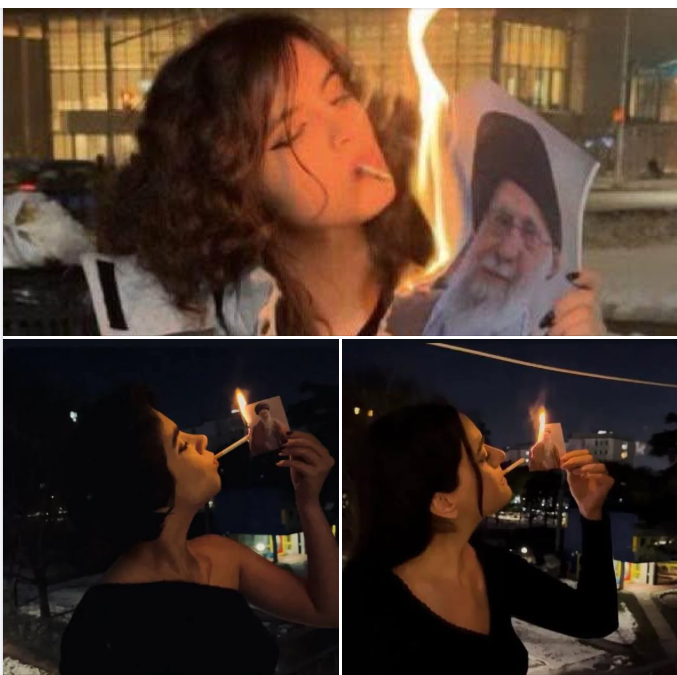 Iranian women light cigarettes with burning photo of their country’s supreme leader