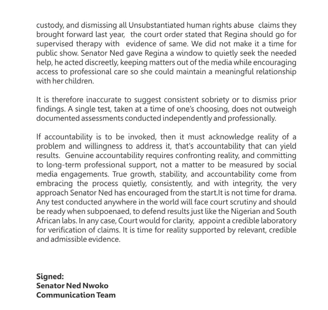 Ned Nwoko has reacted after his estranged wife Regina Daniels submitted herself for a drug test and shared the result. The result of the test, done in the UK, showed that the actress had no drugs in her system. Regina said it became necessary to address the drug addiction allegations made by her estranged husband because she wanted her children to know the truth and to take pride in her. Reacting now, Ned Nwoko stated that “temporary abstinence is not sobriety”. The politician wrote: “DONT BE FOOLED: TEMPORARY ABSTINENCE IS NOT SOBRIETY.” He continued: “Temporary abstinence, does not erase the underlying challenges that brought this situation to light. Recovery and accountability are not matters for social media posts or publtic engagement, they require sustained effort honesty, and a genuine engagement with professional support. “The conditions under which this recent test was conducted remain unclear. ln contrast, earlier findings of drugs and alcohol use were established through assessments conducted by two independent, reputable centres in Nigeria and South Africa. These reports were professionally compiled, formally documented, and will be presented and defended in court, and the centres involved will be subpoenaed to testify to their findings “Presenting a later negative result as proof that no prior use occurred is Misleading and disingenuous. At best, it reflects abstinence over a period of time. It does not invalidate earlier medical reports, nor does it negate what necessitated intervention in the first place. “There has also been an attempt to dilute the seriousness of the substance refered to as MDMA (Molly), regardless of how casually it is referenced or repackaged in language, it is a drug. Renaming it does not alter its chemical composition, its risks, or its impact on judgment and stability. “Moreover, temporary abstinence, whether for weeks or months, does not address the underlying issues that brought this situation to where it is today. “Healing is not episodic, and accountability is not performative. “Long before this matter became public, Senator Ned Nwoko explored every possible avenue to provide support, including private rehabilitation for structured, sustained therapy, not just brief one off, it failed. Denial is never a foundation for sustainable therapy The first step is to own up to the existing problem. When the court gave judgement in favour of Senator Ned having custody, and dismissing all Unsubstantiated human rights abuse claims they brought forward last year, the court order stated that Regina should go for supervised therapy with evidence of same. we did not make it a time for public show. Senator Ned gave Regina a window to quietly seek the needed help, he acted discreetly, keeping matters out of the media while encouraging access to professional care so she could maintain a meaningfut relationship with her children. “It is therefore inaccurate to suggest consistent sobriety or to dismiss prior findings. A single test, taken at a time of one’s choosing, does not outweigh documented assessments conducted independently and professionally. “If accountability is to be invoked, then it must acknowledge reality of a problem and willingness to address it, that’s accountability that can yield results. “Genuine accountability requires confronting reality, and committing to long-term professional support, not a matter to be measured by social media engagements. True growth, stability, and accountability come from embracing the process quietly, consistently, and with integrity, the very approach Senator Ned has encouraged from the start. lt is not time for drama “Any test conducted anywhere in the world will face court scrutiny and should be ready when subpoenaed, to defend results just like the Nigerian and South African labs. In any case, Court would for clarity, appoint a credible laboratory for verification of claims. It is time for reality supported by relevant, credible and admissible evidence.”