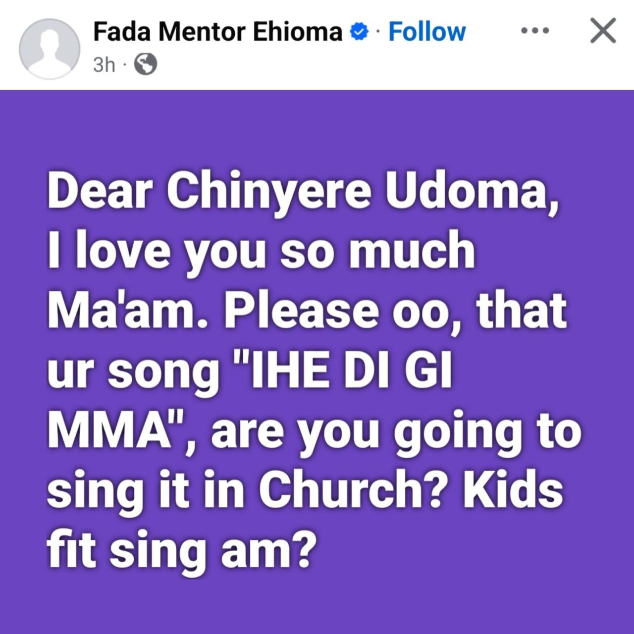 A Catholic Priest has criticised gospel singer Chinyere Udoma for the lyrics of her latest song. The priest questioned why Chinyere used certain words in her song. He went on to ask her if children can sing the song. He wrote: “Dear Chinyere Udoma, I love you so much Ma’am. Please oo, that ur song ‘IHE DI GI MMA’, are you going to sing it in Church? Kids fit sing am?”