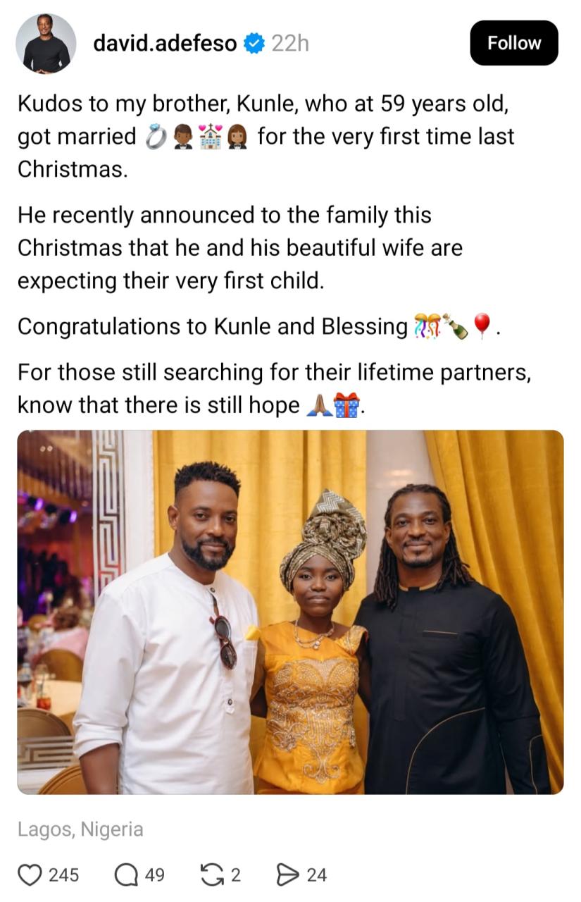 The post “There is still hope” David Adefeso says as he congratulates his brother who got married for the first time at 59 and is now expecting first child with young bride appeared first on Linda Ikeji Blog.