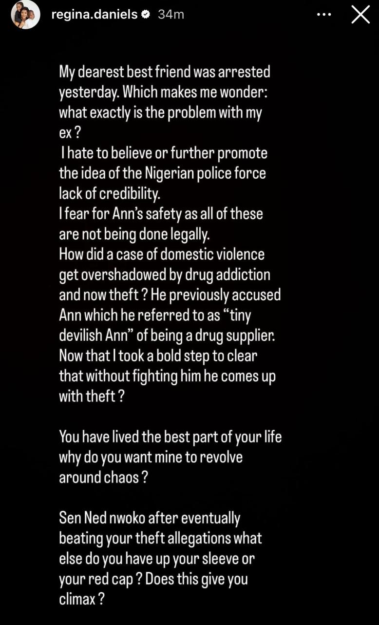 Actress Regina Daniels has taken to social media to call out her estranged husband, Ned Nwoko, for allegedly effecting the arrest of her best friend, Ann. On Monday, January 12, Regina and her brother took to Instagram to call out Ned over Ann’s arrest. They accused Ned of using the police to intimidate them.  In the post shared on her Instastories this afternoon, Regina said she fears for Ann’s safety as the arrest is illegal. She stated that Ned had previously accused Ann of being a drug supplier but has now taken a new accusing Ann of theft. You have lived the best part of your life. Why do you want mine to revolve around chaos?” Regina asked NedRead her post below    The post ”You have lived the best part of your life why do you want mine to revolve around chaos?”- Regina Daniels asks her estranged husband Ned Nwoko appeared first on Linda Ikeji Blog.