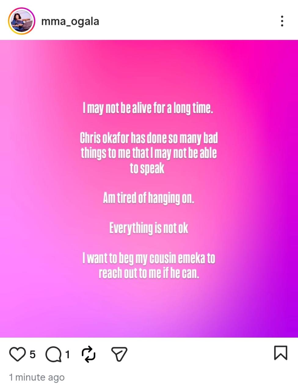 Doris Ogala has sent a cry for help, leaving her followers and fans concerned. The actress, who has been in the news lately for claiming pastor Chris Okafor “used” her and left her to marry another woman, has now shared a new post. She first released a video, disclosing that she is not OK. She mentioned the miscarriages she had, her arrest and detention after she called out Chris Okafor, and also what she suffered when she was married, including coming home to meet her husband’s mistress with a baby. She added that none of what she has been through is OK. She wept as she spoke in the video. She later shared a post that reads: “I may not be alive for a long time. “Chris Okafor has done so many bad things to me that I may not be able to speak. “Am tired of hanging on. “Everything is not OK. “I want to beg my cousin Emeka to reach out to me if he can.”