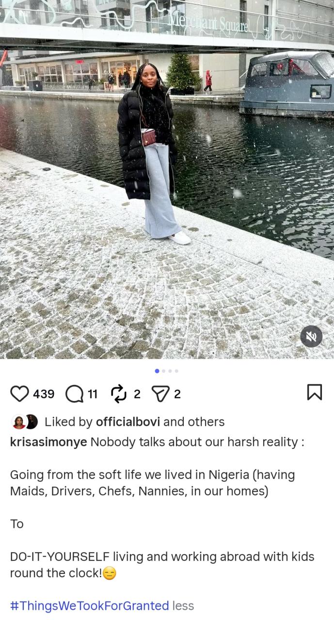 The post Bovi’s wife, Kris Asimoye laments ‘harsh reality’ faced by Nigerians when the leave the ‘soft life’ at home for the life abroad appeared first on Linda Ikeji Blog.