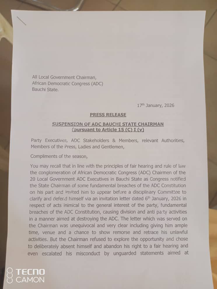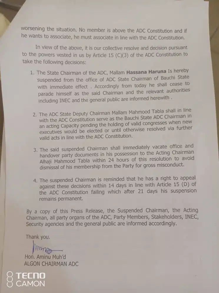 The Bauchi State Chapter of the African Democratic Congress (ADC) is currently facing a leadership crisis following the immediate suspension of its state chairman, Hon. Hassan Haruna.