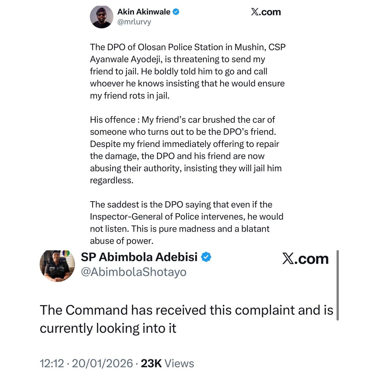 The Lagos State Police command has launched an investigation into the conduct of the Divisional Police Officer of Olosan Police Station in Mushin, CSP Ayanwale Ayodeji, following viral allegation of power abuse and intimidation. An X-user, Akin Akinwale, had taken to his handle to accuse the police DPO of unfair treatment. According to Akinwale, it all started when his friends car brushed the vehicle of an individual who turned out to be a friend of the DPO. He mentioned that despite the motorists immediate offer to repair the damage, Akinwale alleged that CSP Ayodeji used his position to threaten the man with imprisonment. Reacting to his claims, the spokesperson of the command, SP Abimbola Adebisi, said the command will look into the allegation.