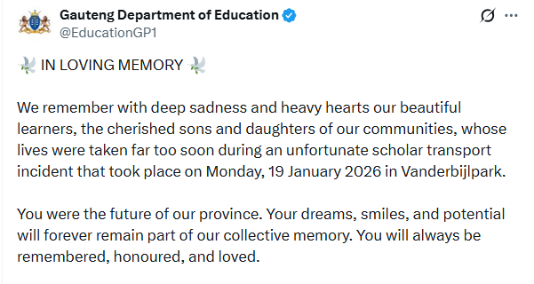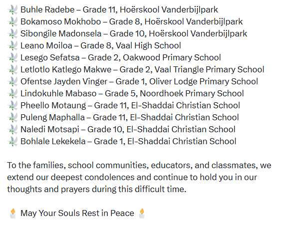 The 22-year-old driver accused of causing the horror crash which claimed the lives of 14 school pupils in Vanderbijlpark, South Africa, appeared in court on Thursday, where he abandoned his bail application. Ayanda Dludla was charged with 14 counts of m8rder, attempted m8rder, driving without a valid permit and driving an unlicensed vehicle following the d3adly crash that occurred on Monday, January 19, 2026. He was driving a scholar transport vehicle on the R553 Golden Highway, transporting 16 pupils, when he collided head-on with an oncoming truck. Families of the deceased learners filled the courtroom as Ayanda Dludla, sporting a scar on his forehead. “When we perused the docket, we saw that there is sufficient evidence to charge the accused with the charges of m8rder, as opposed to culpable homicide,” said National Prosecuting Authority spokesperson in Gauteng, Lumka Mahanjana. As the state, we do have the prima facie evidence to charge the accused with the charges of murder. There is a case that the accused needs to answer. If the accused did not abandon his bail, the case was surely going to oppose his release on bail. He is facing 14 counts of m8rder, those are very serious charges. He is also facing three counts of attempted m8rder. Dludla will return to court on 5 March. The tragic accident has sent shockwaves across Gauteng and the country, Fourteen learners have d!ed from the crash, while others sustained injuries. Three learners are still receiving medical treatment following the crash. Authorities have confirmed that the injured pupils remain in hospital as investigations into the circumstances surrounding the collision continue.. The driver was arrested on Tuesday after being discharged from the hospital, where he had been receiving treatment following the crash. receiving treatment following the crash. Police spokesperson Lieutenant Colonel Mavela Masondo previously said the driver of the truck involved in the crash escaped unharmed, while the trucks passenger sustained injuries and is receiving treatment in hospital. Investigations are ongoing as police continue to obtain witness statements and assess the events leading up to the crash. Meanwhile, the Gauteng Education released names and photos of the victims. Buhle Radebe Grade 11, Horskool VanderbijlparkBokamoso Mokhobo Grade 8, Horskool Vanderbijlpark Sibongile Madonsela Grade 10, Horskool Vanderbijlpark Leano Moiloa Grade 8, Vaal High School Lesego Sefatsa Grade 2, Oakwood Primary School Letlotlo Katlego Makwe Grade 2, Vaal Triangle Primary School Ofentse Jayden Vinger Grade 1, Oliver Lodge Primary School Lindokuhle Mabaso Grade 5, Noordhoek Primary School Pheello Motaung Grade 11, El-Shaddai Christian School Puleng Maphalla Grade 11, El-Shaddai Christian School Naledi Motsapi Grade 10, El-Shaddai Christian School Bohlale Lekekela Grade 1, El-Shaddai Christian School