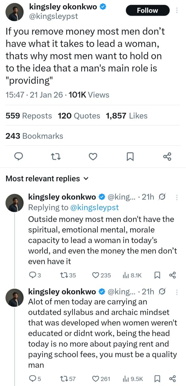 Pastor Kingsley Okonkwo has stated that many men lack what it takes to be good leaders. He took to X to write that once finances are removed from the equation, most men lack the spiritual, emotional, mental, and moral capacity required to truly lead a woman. He wrote: “If you remove money most men dont have what it takes to lead a woman, thats why most men want to hold on to the idea that a man’s main role is ‘providing’. “Outside money most men don’t have the spiritual, emotional mental, morale capacity to lead a woman in today’s world, and even the money the men dont even have it. “Alot of men today are carrying an outdated syllabus and archaic mindset that was developed when women weren’t educated or didnt work, being the head today is no more about paying rent and paying school fees, you must be a quality man.”