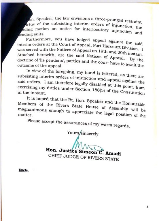 In a letter dated January 20 and addressed to the Speaker of the Assembly, Martins Amaewhule, the chief judge said he could not take any step on the request because of two court orders currently restraining him from doing so.