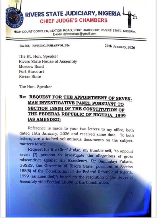 The Chief Judge of Rivers State, Justice Simeon Chibuzor-Amadi, has declined the request of the Rivers State House of Assembly to constitute a judicial panel to investigate Governor Siminalayi Fubara and his deputy, Prof. Ngozi Odu, over allegations of gross misconduct.