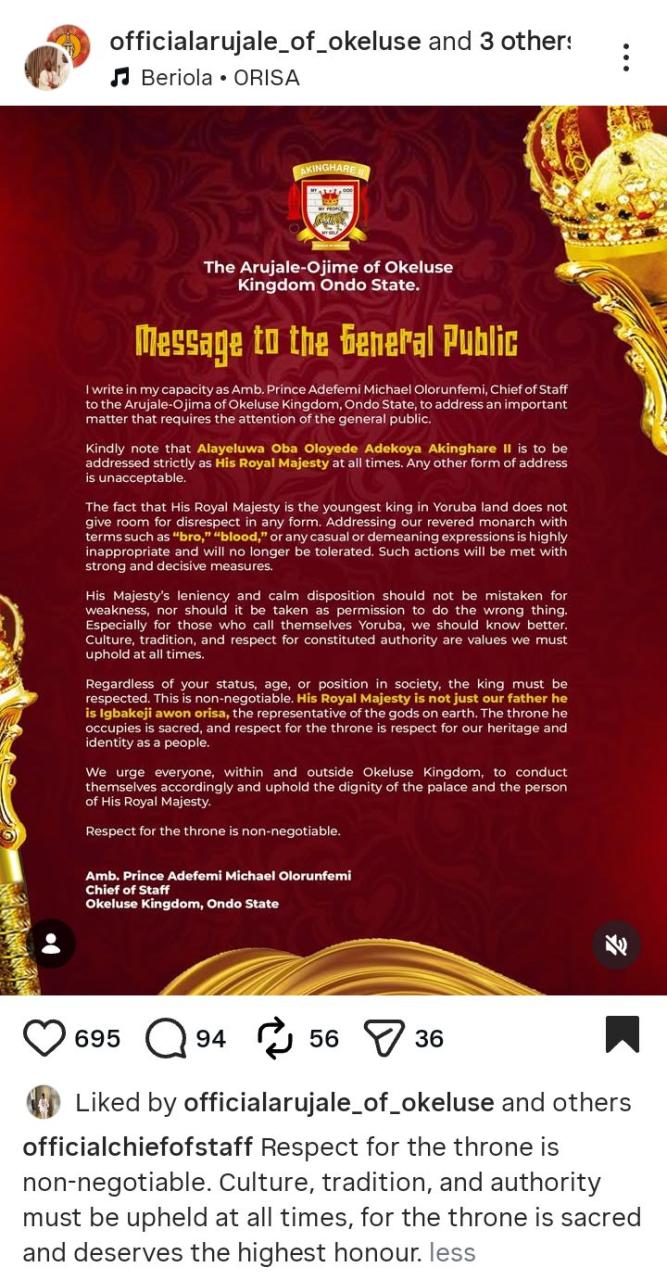 The palace of the Arujale-Ojime of Okeluse Kingdom, Ondo State, has issued a stern warning to the general public to stop addressing the 22-year-old traditional ruler, Oba Oloyede Adekoya Akinghare II, with demeaning and inappropriate expressions. Oba Akinghare ascended the throne in 2020 at age 16 after the d3ath of his father, making him the youngest monarch in Yoruba land. He graduated from secondary school in 2022. In a statement issued on Thursday, January 22, 2026, by the Chief of Staff to the monarch, Prince Adefemi Olorunfemi, the palace reiterated that everyone must strictly address the king as His Royal Majesty at all times, regardless of their status, age, or position in society. According to him, addressing the monarch as bro or blood or other demeaning expressions will no longer be tolerated, warning that such actions will be met with strong and decisive and measures. He noted that the fact that Oba Akinghare is the youngest king in Yoruba land does not warrant disrespect.. I write in my capacity as Amb. Prince Adefemi Michael Olorunfemi, Chief of Staff to the Arujale-Ojima of Okeluse Kingdom, Ondo State, to address an important matter that requires the attention of the general public. Kindly note that Alayeluwa Oba Oloyede Adekoya Akinghare II is to be addressed strictly as His Royal Majesty at all times,” the statement read. Any other form of address is unacceptable. The fact that His Royal Majesty is the youngest king in Yoruba land does not give room for disrespect in any form. Addressing our revered monarch with terms such as bro, blood, or any casual or demeaning expressions is highly inappropriate and will no longer be tolerated. Such actions will be met with strong and decisive measures. His Majestys leniency and calm disposition should not be mistaken for weakness, nor should it be taken as permission to do the wrong thing. Especially for those who call themselves Yoruba, we should know better. Culture, tradition, and respect for constituted authority are values we must uphold at all times. Regardless of your status, age, or position in society, the king must be respected. This is non-negotiable. His Royal Majesty is not just our father; he is Igbakeji awon orisa, the representative of the gods on earth. The throne he occupies is sacred, and respect for the throne is respect for our heritage and identity as a people. The palace called on residents of Okeluse Kingdom and the general public to always uphold the dignity of the throne, stressing that respect for the monarch remained central to the preservation of Yoruba culture and tradition. We urge everyone, within and outside Okeluse Kingdom, to conduct themselves accordingly and uphold the dignity of the palace and the person of His Royal Majesty. Respect for the throne is non-negotiable, the statement added.
