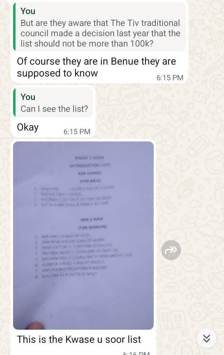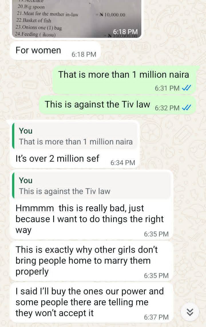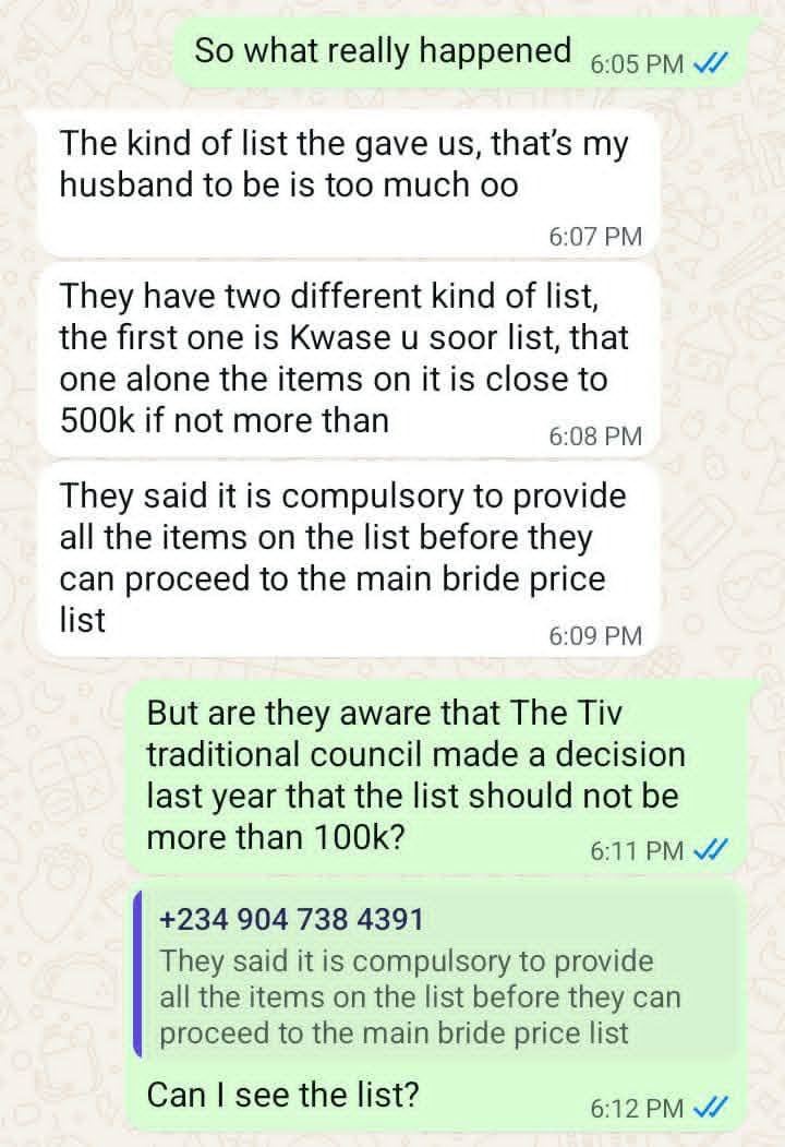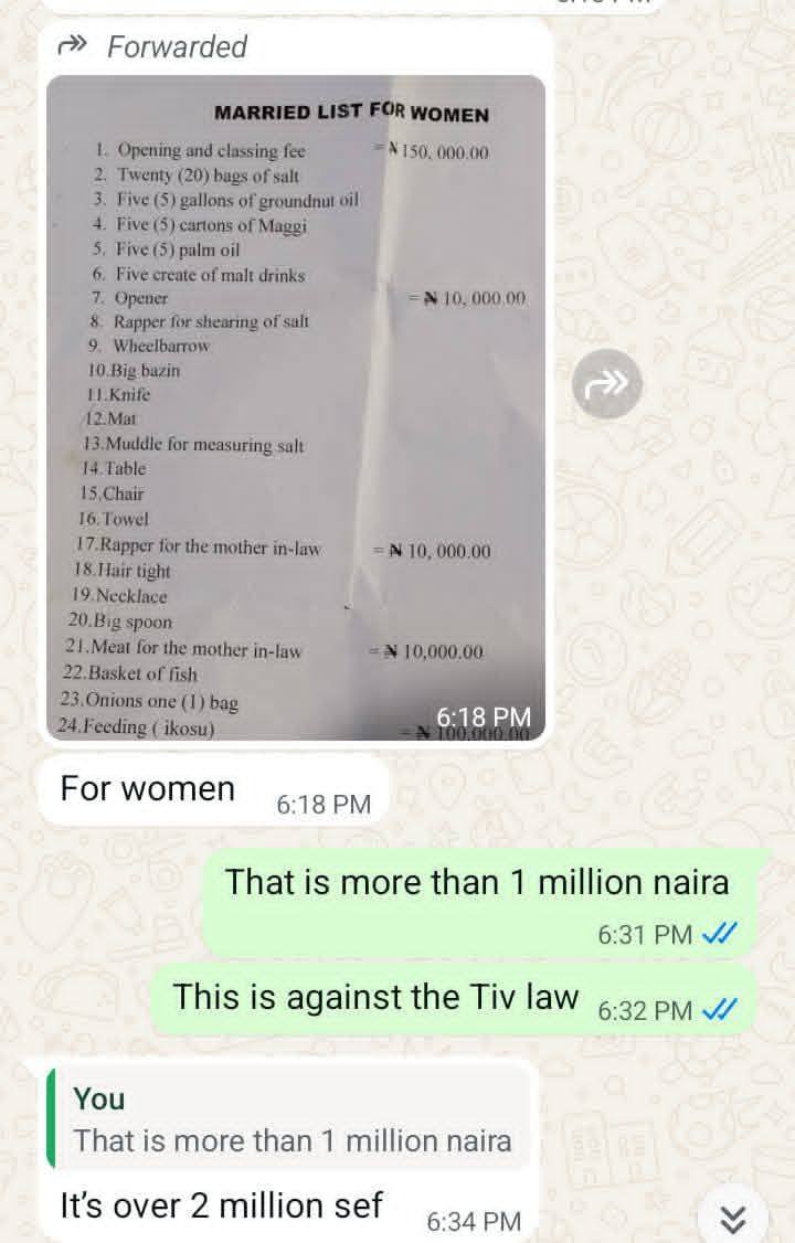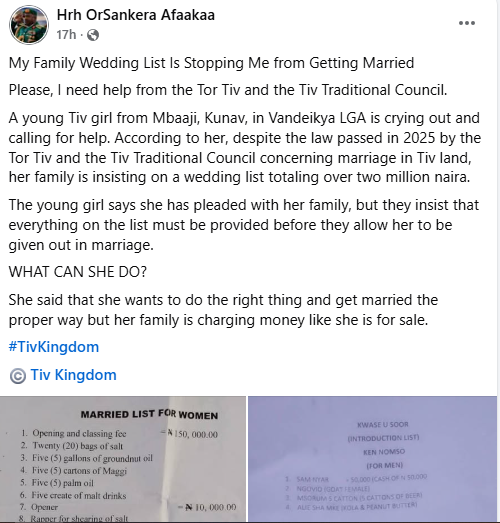 A young Tiv woman from Mbaaji, Kunav, in Vandeikya Local Government Area of Benue State has cried out for help, alleging that her family is demanding a marriage list totaling over N2 million from her suitor. According to her, despite the law passed by the Tor Tiv and the Tiv Traditional Council concerning marriage in Tiv land, her family insisted that her suitor must provide all the items on the list. Recall that the Tiv Traditional Council pegged marriage lists at not more than N1,000 to curb excessive marriage demands in Tivland. The woman said the development has stalled her plans to marry. She explained that repeated pleas to her family to reduce the list in line with the directive were rejected, with relatives insisting that all items on the list must be provided before she could be given out in marriage. The marriage list my family issued is stopping me from getting married. I am pleading with the Tor Tiv and the Tiv Traditional Council to come to my aid, she said. The case has sparked public concern, particularly among residents of Vandeikya, who questioned how some communities reportedly issue marriage lists running into millions of naira despite the standing traditional order.
