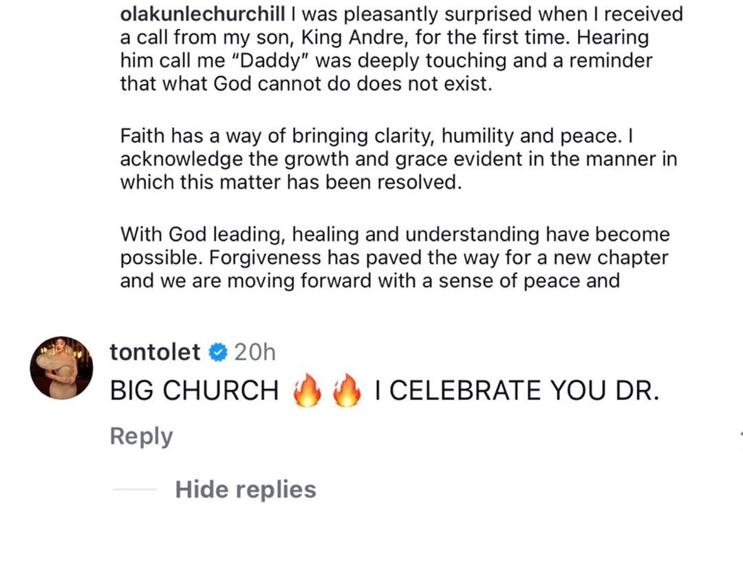 Over the weekend, Tonto Dikeh announced that herself and her ex-husband, Olakunle Churchill, have ended their 10-year feud and have decided to co-parent their son, Churchill in peace. On Sunday, January 25, Churchill took to his IG page to recount how happy he is reuniting with his son and hearing his son call him Daddy’ for the first time. Tonto surprised many when she went under his comment to hail him.