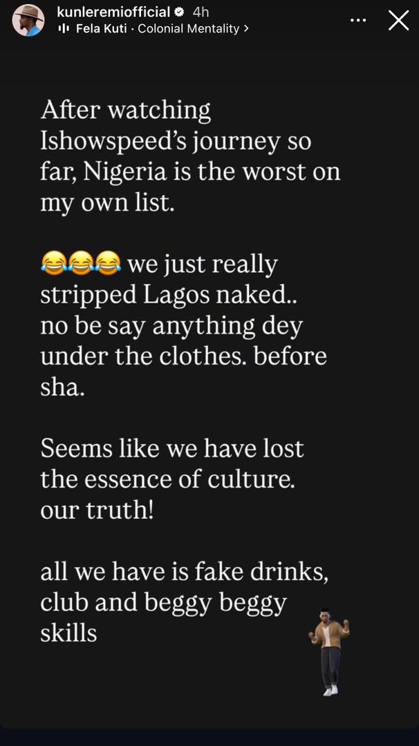 Actor Kunle Remi says going by his own observation, the visit of popular American streamer, Ishowspeed, to Nigeria is the worst when compared to the streamer’s visit to other countries in Africa. Ishowspeed was in Lagos, Nigeria last week and has since moved to other African countries. Kunle says Speeds visit exposed Lagos state. He stated that the visit showed that the only things Lagos can offer  are fake drinks, clubs and beggy beggy skills”. Read his post below  The post After watching Ishowspeeds journey so far, Nigeria is the worst on my own list – Actor Kunle Remi appeared first on Linda Ikeji Blog.