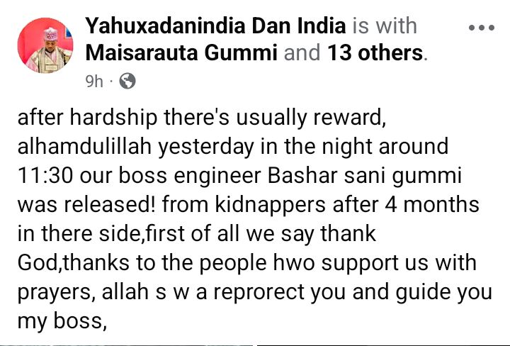 A Zamfara engineer, Bashar Sani Gummi, has regained freedom after 4 months in bandits’ captivity. Gummi was a kidnapped in the first week of October 5, 2025. The abductors released him on Tuesday night, January 27, 2026. Family members on Wednesday, January 28, shared photos and video of Bashar looking like a shadow of his former self.