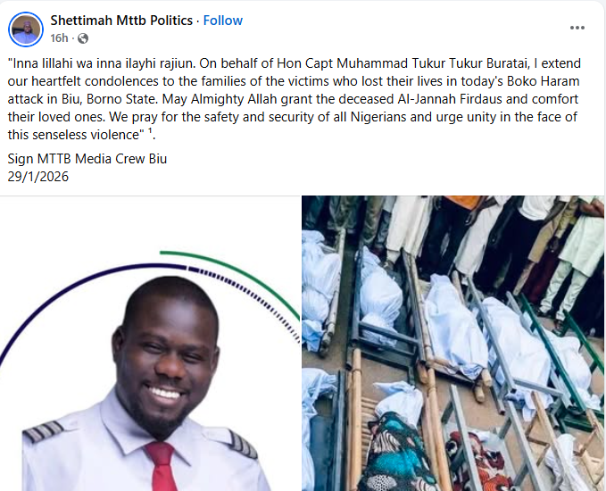 Suspected Boko Haram terrorists have reportedly k!lled dozens of people in an overnight attack in Borno State, local sources told AFP. The attack happened on Thursday, January 29, 2026 in Sabon Gari in remote Borno state, which has been the epicentre of an Islamist insurgency by Boko Haram and its Islamic State West Africa Province (ISWAP) offshoot rival since 2009. “The d3ath toll runs into dozens,” said Ibrahim Liman, a member of the Civilian Joint Task Force (CJTF). More bodies are still at the base while many soldiers are missing, he added. Liman said 20 bodies, including those of five soldiers and 15 construction workers, and local hunters were taken to the general hospital in the nearby town of Biu. Bukar Yamta Ali, secretary of a local hunters’ group in Yamarkumi, near Biu, and two nurses at Biu hospital confirmed they had recovered bodies and wounded from Sabon Gari. The victims were working on a road bridge that was destroyed last year in another jihadist attack, and were returning to their base when they were attacked. Most of the victims, who hailed from Biu Local Government Area were buried according to Islamic rite after a funeral prayer held at the Emir of Biu’s Juma’at Mosque on Friday.