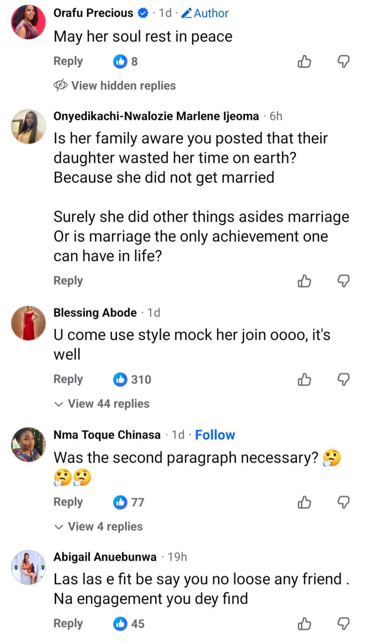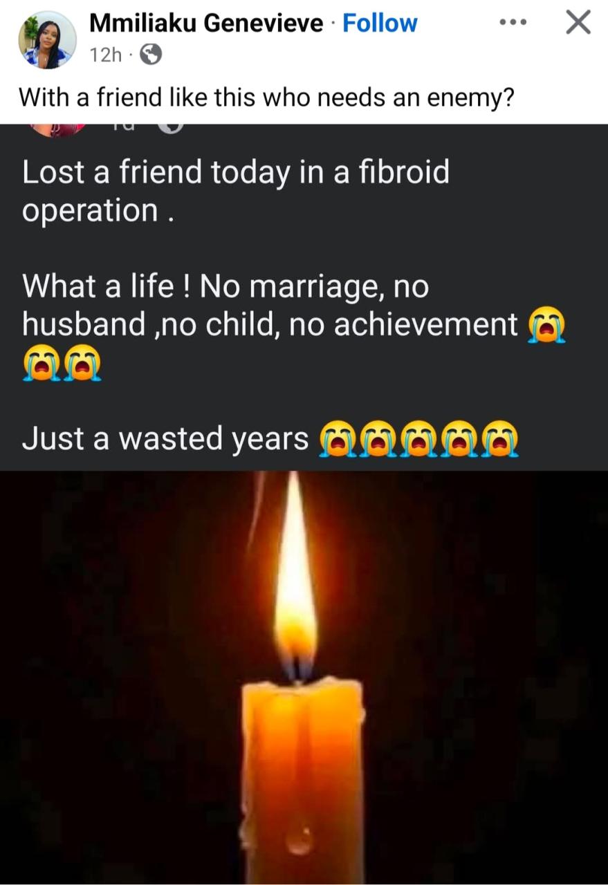 A woman has been told that she is an “enemy”, not a friend after she made a post on Facebook to announce the dath if someone she calls her friend. Orafu Precious wrote: “Lost a friend today in a fibroid operation . “What a life ! No marriage, no husband ,no child, no achievement. “Just a wasted years.” Facebook users have now slammed Precious for her post. See below.