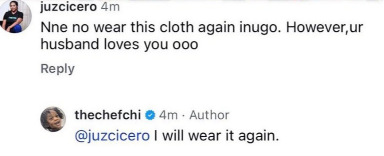 However, one follower wrote: “Nne no wear this cloth again inugo. However, your husband loves you ooo.” Chioma responded: “I will wear it again.”