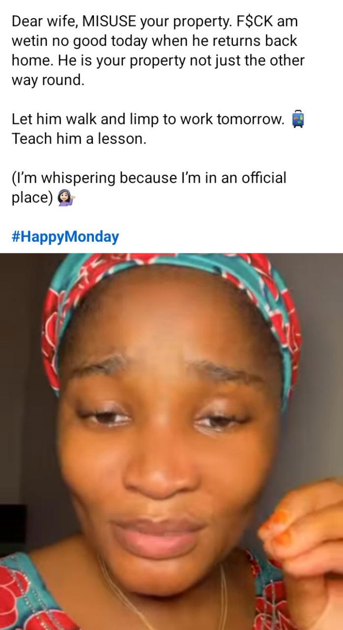 A Nigerian Muslim woman, Hussaina Sufyan Ahmed, has advised married women to take the initiative if they are experiencing s3xual deprivation in their marriage. She argued that a healthy man has a high s3x drive hence it’s not possible for him to go without physical intimacy for weeks or months.  According to her, a man who claims he is too tired, stressed or overworked, to have sex with his wife has simply exhausted his energy on a side chick. She therefore advised women to ‘misuse their property’ when their husbands return home, so the men will “limp to work” the next day.  Correct me if Im wrong but can men do without mating? NO! Its biology, you cannot argue. Except of course there is a health problem somewhere youre not telling anyone. A married man will leave his wife and not copulate with her for weeks or months and claim it is because he is busy at work and mentally unhealthy.  However, it is a sorry situation to know that most of the time, he is only tired simply because he has exhausted his energy on his extra marital partner.  As a wife, I wont advise you but I believe while youre the legal one, you should not allow cobwebs manifest in your simply because you have decided to be an understanding wife. A man can avoid s3x but not so long because men develop blue balls when they dont ejaculate, because as long as theyre not virgins, the memory of copulating and ejaculating doesnt leave their memory easily, most especially completely for weeks and months? Oh please! Dear wife, MISUSE your property. F$CK am wetin no good today when he returns back home. He is your property, not just the other way round. Let him walk and limp to work tomorrow. Teach him a lesson.  (Im whispering because Im in an official place).       View this post on Instagram           A post shared by Lindaikejiblog (@lindaikejiblogofficial) The post Don’t allow cobwebs manifest because you want to be an understanding wife – Nigerian woman addresses married women experiencing s3xual deprivation (video) appeared first on Linda Ikeji Blog.