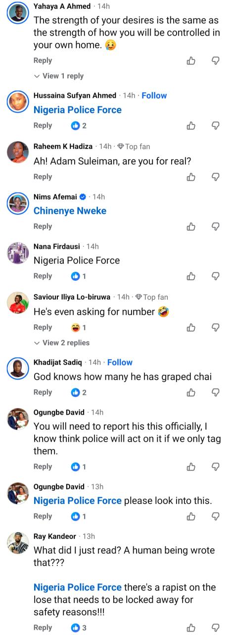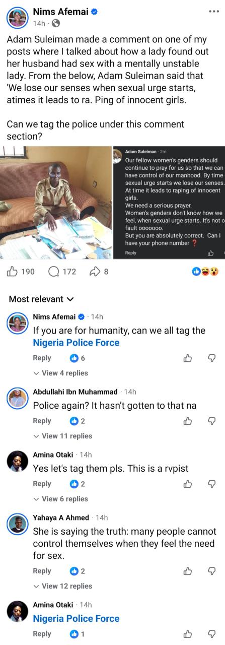 Nigerians on Facebook are tagging the police to go after a corps member whom they believe might not be safe to be around girls. Concern grew after the corps member stated that when “sxual urges start, we lose our senses. At times it leads to r@ping of innocent girls.” He added: “We need serious prayers. Women’s gender don’t know how we feel when sxual urges start.”  His comment was in response to a married man who r@ped a woman who is mentally ubstable.  While his comment got support from some men, others slammed him and began reporting him, asking the police to make sure he has no access to girls where he’s serving. The post Nigerians call attention of police to corps member who said he can’t control himself sxually appeared first on Linda Ikeji Blog.
