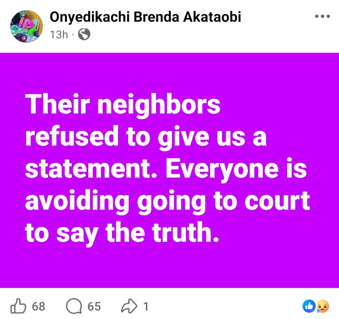 More details have continued to emerged following the de@th of Olumma Chizoba Lucy Akataobi,  a mother-of-two. The 29-year-old mum did on the evening of Monday, Feb. 2.  Her sister, Ezinne Onyedikachi Brenda Akataobi claims the husband, Kelechi Prince Okeke, be@t her to de@th after she asked him to give her her N35,000 which her customer paid into to her husband’s account. Meanwhile,  the accused husband Kelechi claims Olumma was eating when she screamed “my chest, my chest”, vomited and did.  Ezinne says this is not true as her sister was with their mother earlier that day and even went to the market to conduct her business and she was clearly well. Ezinne also said neighbours claimed they heard the couple quarreling inside their house shortly before Olumma did. Ezinne has shared a voice note of a call with a neighbour who mentioned that she had just returned from church and was too tired to intervene when she heard the couple quarrelling. As Ezinne shared these details on Facebook, a woman named Joy Maurice commented. She claimed the husband, Kelechi, was her tenant some years back when he was still dating Olumma. Joy Maurice claims Kelechi used to be@t Olumma whenever she visits him while they were dating and she warned Olumma to leave him. Instead, Olumma stopped greeting her. She said she eventually gave Kelechi quit notice.  Ezinne has said the family wants to conduct an autopsy to discover the cause of her sister’s de@th but they do not have the financial resources for this.The post “I warned her to leave the guy because he be@ts her” Former landlady reveals what she witnessed when woman, 29, allegedly k!lled by her husband was still dating him appeared first on Linda Ikeji Blog.