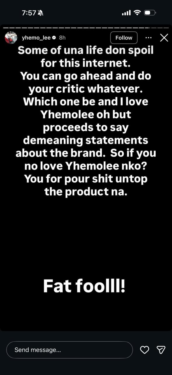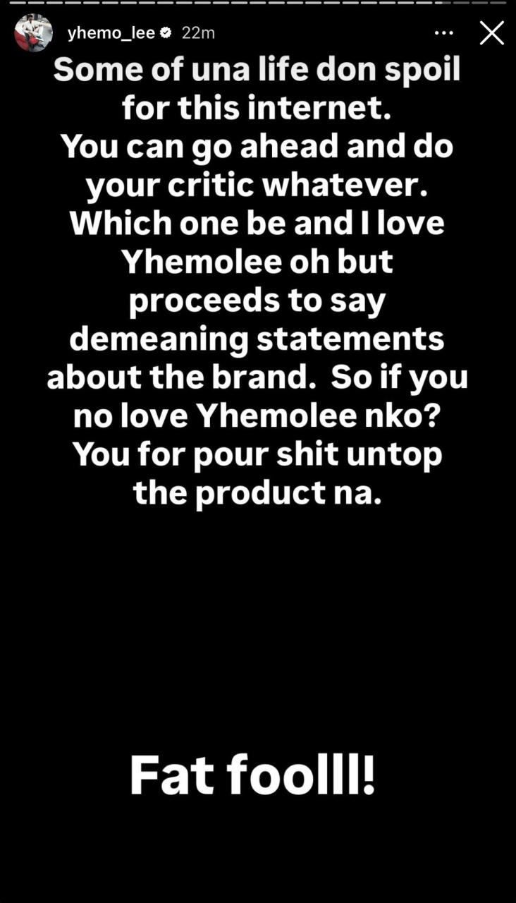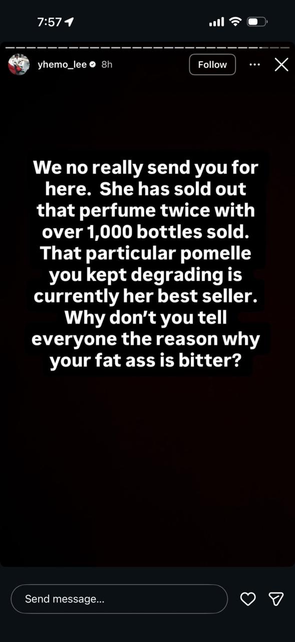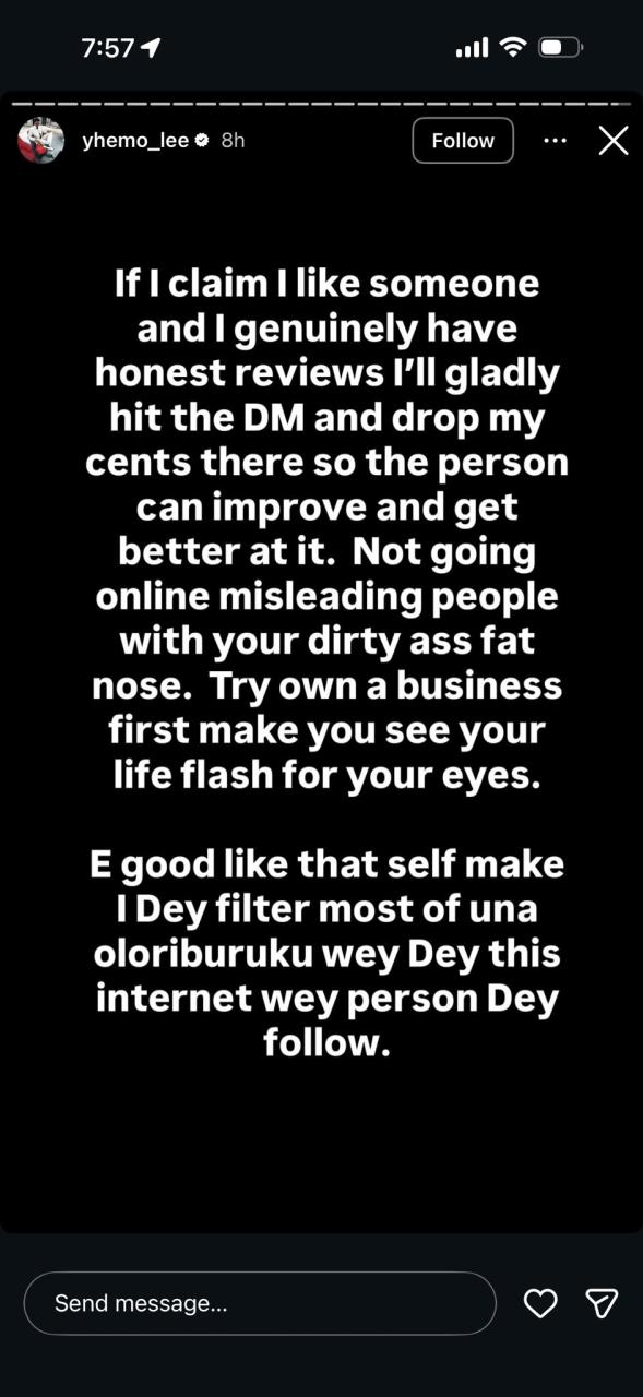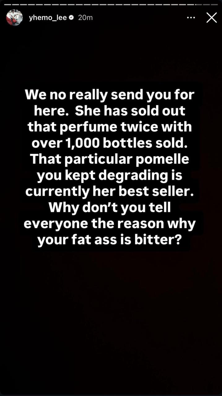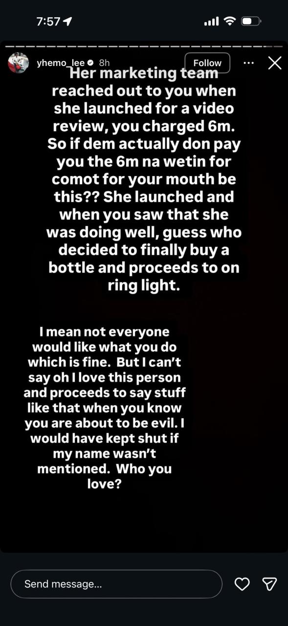 Nightlife Influencer Yhemolee fires back at food critic Opeyemi over review of his wifes perfumeSocial media drama has broken out after night life influencer, Yhemolee responded angrily to a review made by food critic Opeyemi about his wifes perfume brand. In a series of heated posts, Yhemolee accused Opeyemi of pretending to like him while making what he described as demeaning and unnecessary comments about the perfume. He questioned the logic of saying I love Yhemolee and then going ahead to rubbish a product tied to his household. According to Yhemolee, the perfume brand is doing just fine without the review. He revealed that the fragrance has sold out twice, with over 1,000 bottles sold, adding that the particular scent Opeyemi criticised is currently the best seller. He also claimed that the brands marketing team had previously reached out to Opeyemi for a launch review, but the critic allegedly demanded 6 million. Yhemolee suggested that the negative review only came after the business started doing well without him. The nightlife personality further stated that if the criticism was truly constructive, it should have been shared privately rather than online, especially since his name was mentioned. He ended by saying the situation has helped him filter the kind of people he associates with online. The post Nightlife Influencer Yhemolee fires back at food critic Opeyemi over review of his wifes perfume appeared first on Linda Ikeji Blog.