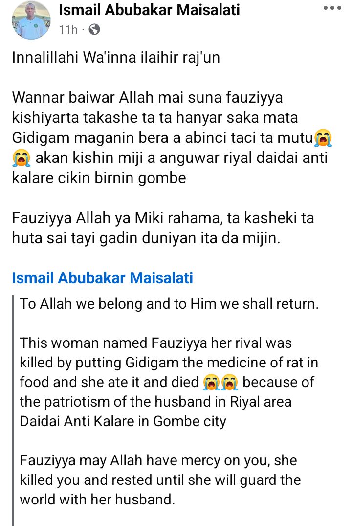 A tragic incident has shaken a community in Gombe city, where a woman identified as Fauziyya reportedly d!ed after being poisoned by her co-wife. The incident which occurred in the Riyal Anti Kalare neighborhood within Gombe metropolis, sent shockwaves through the local community. According to a local source, Ismail Abubakar Maisalati, the fatal act was driven by jealousy over their husband. The suspect is alleged to have laced the victim’s food with poisonous substance known locally as Gidigam Fauziyya consumed the tainted meal, unaware of the deadly plot against her life. Eyewitness accounts and community members suggest that tensions between the co-wives had been simmering due to competition for their husband’s attention and affection. According to one Maisalati, the young woman’s d3ath has left behind grieving family members, including her husband and children who must now navigate life without her. Community members have expressed prayers for the deceased, with many calling for justice and urging authorities to investigate the matter thoroughly.