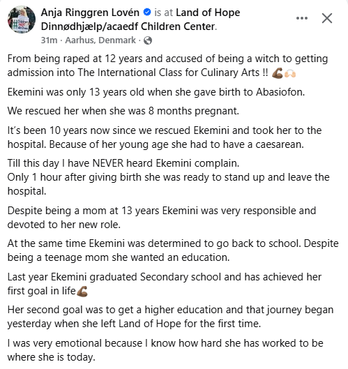 A young girl who was rescued after she was r@ped at 12, accused of being a witch and abandoned in Akwa Ibom State has gained admission into The International Class for Culinary Arts in Denmark. LIB reported that Danish aid worker Anja Loven Ringgren and her Nigerian husband, David Emmanuel Umem, rescued Ekemini in May 2016. Ekemini became pregnant as a result of the r@pe and gave birth at 13 through caesarean section as her pelvis was not fully developed. Giving an update in a Facebook post on Wednesday, February 4, 2026, Ms Ringgren revealed that Ekemini, now 23, left the orphanage yesterday for culinary school 10 years after surviving childhood r@pe, teenage pregnancy and abandonment. From being r@ped at 12 years and accused of being a witch to getting admission into The International Class for Culinary Arts !!, she wrote. Ekemini was only 13 years old when she gave birth to Abasiofon. We rescued her when she was 8 months pregnant. Its been 10 years now since we rescued Ekemini and took her to the hospital. Because of her young age she had to have a caesarean. To this day I have NEVER heard Ekemini complain. Only 1 hour after giving birth she was ready to stand up and leave the hospital. Despite being a mom at 13 years, Ekemini was very responsible and devoted to her new role. At the same time Ekemini was determined to go back to school. Despite being a teenage mom she wanted an education. Last year Ekemini graduated Secondary school and has achieved her first goal in life Her second goal was to get a higher education and that journey began yesterday when she left Land of Hope for the first time. I was very emotional because I know how hard she has worked to be where she is today. With your support to Land of Hope you gave Ekemini a new life full of dreams. She raised her son in our care with much pride and joy. Abasiofon turns 10 this summer and despite how difficult it was for Ekemini to travel away from her son she knows she has raised a strong, intelligent young man who is well taken care of at Land of Hope. She never had a youth like her peers due to early motherhood so now is her time to experience life on her own and she deserves every bit of it! Congratulations, my sweet daughter. Go conquer the world. Im soooooo proud of you.