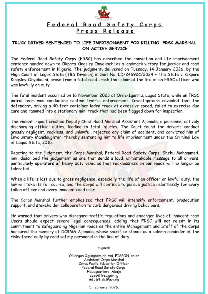 The Federal Road Safety Corps (FRSC) has described the conviction and life imprisonment of a truck driver , Okpara Onyekachi as a landmark victory for justice and road safety enforcement in Nigeria. The FRSC Corps Marshal, Malam Shehu Mohammed, said this in a statement by the Corps Public Education Officer, Olusegun Ogungbemide, on Friday, February 6, 2026 in Abuja. Onyekachi was convicted over the d3ath of Deputy Chief Road Marshal Assistant Abiodun Ajomale, who was k!lled during a routine FRSC patrol at Orile-Iganmu, Lagos. He welcomed his third child with his wife two months before the incident. The judgment was delivered on Tuesday, January 14, 2026 by the High Court of Lagos State, TBS Division, in Suit No. LD/24692C/2024 The State v. Okpara Onyekachi. According to the court, the convict drove a 40-foot container-laden truck at excessive speed and rammed into a stationary mini truck that had been flagged down for inspection. The impact fatally injured Ajomale, who was on lawful duty at the time. The court held that the driver acted in a grossly negligent, reckless and unlawful manner, rejecting claims that the crash was accidental. He was subsequently convicted of involuntary manslaughter and sentenced to life imprisonment under the Criminal Law of Lagos State, 2015. According to Mohammed, the incident occurred on November 16, 2023, at Orile-Iganmu, Lagos State, during a routine traffic enforcement operation by an FRSC patrol team. Investigations revealed that the defendant, who was driving a 40-foot container-laden truck at excessive speed, failed to exercise due care and rammed into a stationary mini truck that had been flagged down for inspection. The impact crushed Deputy Chief Road Marshal Assistant (DCRMA), Ajomale, who was actively discharging his official duties, inflicting fatal injuries. The court held that the drivers actions were grossly negligent, reckless, and unlawful, rejected any claim of accident, and consequently convicted him of involuntary manslaughter “He was sentenced to life imprisonment under the Criminal Law of Lagos State, 2015, he said. Mohammed said the judgment sends a strong and unmistakable message to all road users, particularly operators of heavy-duty vehicles, that recklessness on Nigerian roads will no longer be tolerated. He stressed that whenever a life was lost due to gross negligence, especially the life of an officer on lawful duty, the law would take its full course, adding that the Corps would continue to pursue justice for every fallen officer and innocent road user. The Corps Marshal further disclosed that the FRSC would intensify enforcement, strengthen prosecution support, and deepen collaboration with stakeholders to curb dangerous driving behaviours nationwide. He warned that drivers who flout traffic regulations and endanger lives should expect severe legal consequences, reaffirming the Corps unwavering commitment to safeguarding Nigerian roads. He also noted that the entire management and staff of the FRSC honoured the memory of DCRMA Ajomale, whose sacrifice remains a sobering reminder of the risks faced daily by road safety personnel in the line of duty.