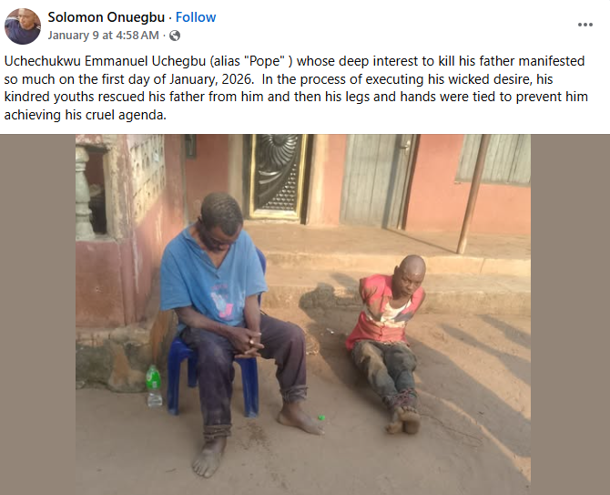 The Abia State Police Command has arrested one Uchechukwu Uchegbu, for k!lling his father, Emmanuel Uchegbu, over a long-standing property dispute. The incident occurred in Elugwu Nkata community in Umuahia North Local Government Area of the state. A family member, Chinedu Uche, who spoke to Punch on Thursday, February 5, 2026 said that the conflict began when the suspect allegedly tried to convert a family land for personal use, a move his father resisted.  The disagreement reportedly escalated into repeated assaults over the years. He started suddenly having money and began forcefully claiming lands that were meant to be shared among my father and his siblings. He even decided to build a house on one of the lands that had not yet been divided, which made my father furious, he said.  The land he claimed shares a boundary with my fathers property. He tried to encroach on my fathers land, but my father refused. Thats where the dispute started. On several occasions over the years, he allegedly beat up his father, destroyed his properties, and threatened to seize his fathers house, claiming that because he had money, he could take it over. According to the family member, the final alleged assault occurred on January 1, 2026, when the suspect reportedly attacked his father with a cutlass, leaving him critically injured.  The elderly man was rushed to the Federal Medical Centre, Umuahia, where he remained hospitalised until his d3ath on January 31. Uche said the suspect was briefly arrested after the January 1 incident but was released, only to be re-arrested following his fathers d3ath. The spokesperson of the command, Maureen Chinaka, who confirmed the incident said the suspect is in custody and that an investigation is ongoing Yes, there is a case under investigation at the State Criminal Investigation Department. The suspect has been apprehended and remains in our custody while the investigation continues, she said.   The post Man allegedly k!lls his father over land dispute in Abia community appeared first on Linda Ikeji Blog.