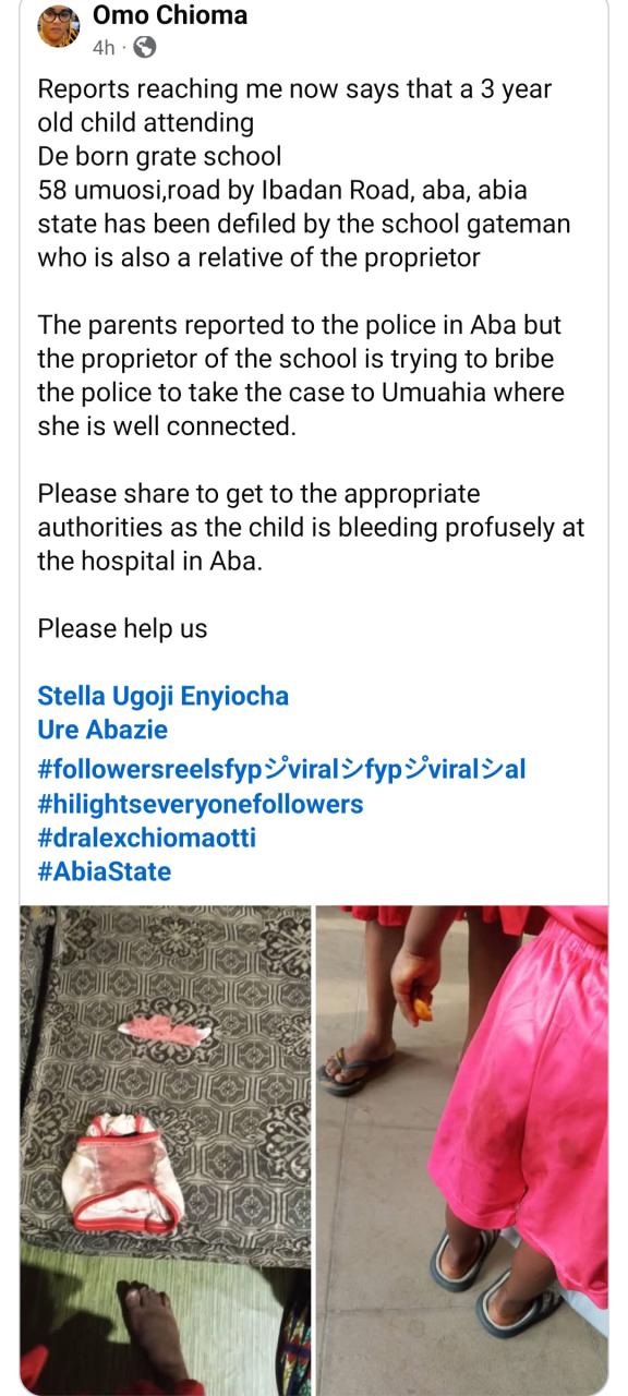 Nigerians on social media are expressing outrage and demanding justice after a 3-year-old girl taken to school by her family was found to be bleding in her panties. According to unconfirmed reports, it was alleged that the gateman of the school was the one who subjected the toddler to sxual ass@ult. The school is said to be situated at 58 Umuosi Road, by Ibadan Road, Aba, Abia state. A Facebook user, Omo Chioma shared photos of the victim and claimed that the perpetrator is related to the proprietor of the school. She added: “The parents reported to the police in Aba but the proprietor of the school is trying to bribe the police to take the case to Umuahia where she is well connected. “Please share to get to the appropriate authorities as the child is bleeding profusely at the hospital in Aba.”