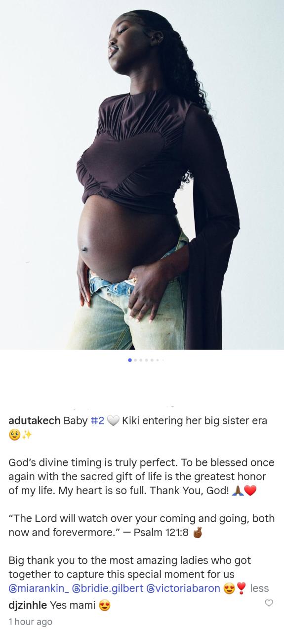 Adut Akech is set to welcome her second child. The supermodel made the announcement on Instagram. Sharing maternity photos with her baby bump on display, she wrote: “Baby #2 Kiki entering her big sister era “Gods divine timing is truly perfect. To be blessed once again with the sacred gift of life is the greatest honor of my life. My heart is so full. Thank You, God!” She then added a bible quotation that reads, The Lord will watch over your coming and going, both now and forevermore. Psalm 121:8.