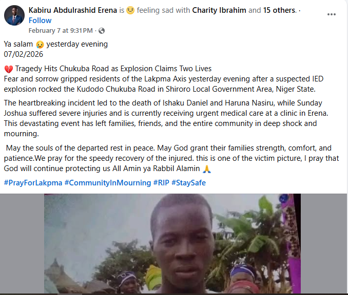 Two persons were k!lled and another injured following the explosion of an improvised explosive device (IED) along KudodoKampani Community Road in Shiroro Local Government Area of Niger State. The incident occurred on February 7 at about 7:30p.m., when three men Haruna, 40; Ishayaku, 36; and Sunday Joshua, 35, all of Chikuba village riding a motorcycle ran into the device, triggering the explosion.  According to security analyst Zagazola Makama, Haruna and Ishayaku d!ed on the spot, while Sunday Joshua sustained injuries and was rushed to Shekwoiyha Divine Primary Health Care Center, Erena, for treatment.  The scene was visited by police, and the case has been referred to the Bomb Disposal Unit for further investigation and necessary action.  The post Two k!lled, one injured in IED explosion in Niger State appeared first on Linda Ikeji Blog.