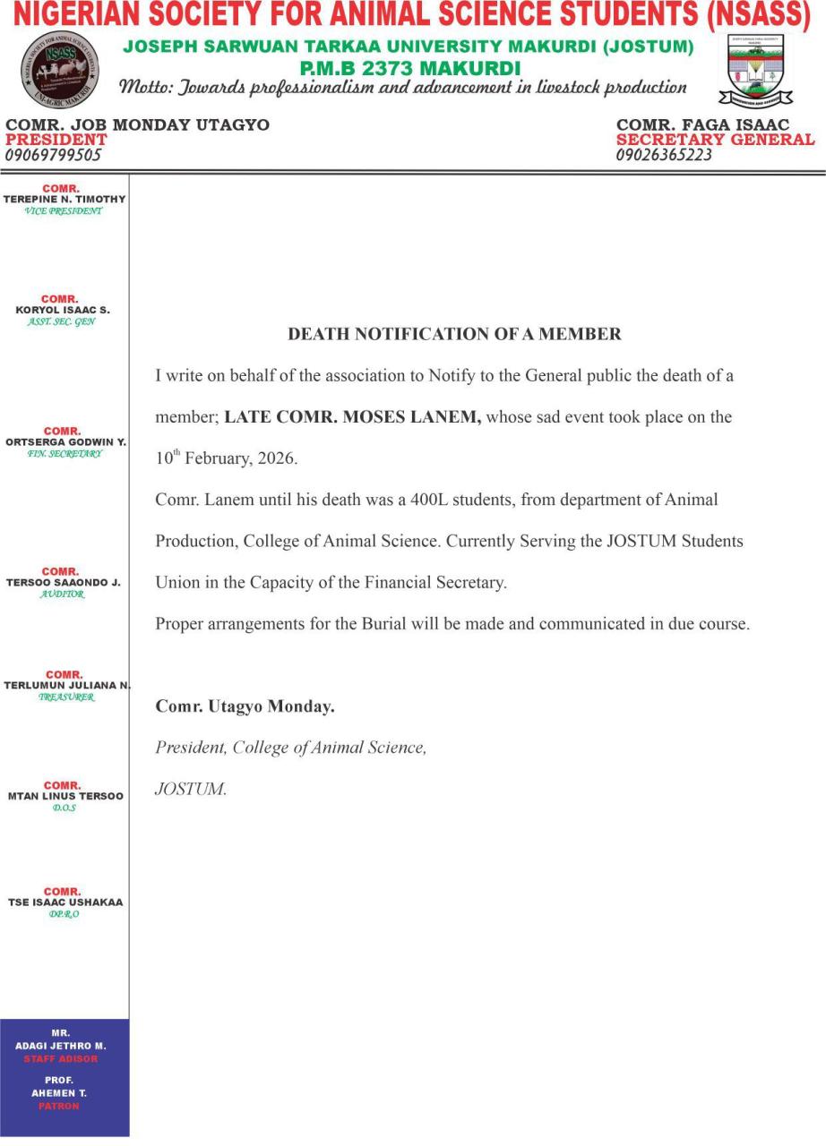 A student of the Joseph Sarwuan Tarka University, Makurdi (JOSTUM), Benue State, Lanem Moses Chianenter, was found d3ad near Utambe residence in Ujam village, a community located close to the varsity. Chianenter was a 400 level student in the department of Animal Production. The incident, which occurred in the early hours of Tuesday, February 10, 2026 has thrown both the university community and residents of the area into shock and mourning. According to sources within the community, the lifeless body was discovered near the student-populated settlement, prompting immediate distress calls to security operatives. Police authorities have since commenced investigations to determine the circumstances surrounding the d3ath. Until his death, the deceased was the current serving President of the National Association of Ukum Students (NAUS) JOSTUM Chapter and the Financial Secretary of JOSTUM Students Union.