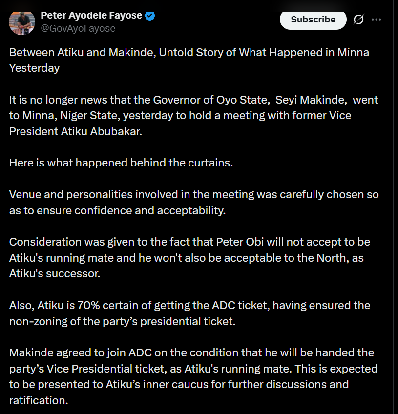 Former Ekiti State Governor Ayodele Fayose has alleged details of discussions that reportedly took place between Oyo State Governor Seyi Makinde and former Vice President Atiku Abubakar during their recent meeting in Minna, Niger State.In a statement issued on Wednesday, February 11, and shared on his verified X account, titled Between Atiku and Makinde, Untold Story of What Happened in Minna, Fayose claimed that the meeting venue and participants were carefully selected to ensure what he described as confidence and acceptability among political stakeholders.According to Fayose, discussions centred on preparations for the next presidential election and concerns about the choice of a possible running mate. He alleged that Atikus camp believes that Labour Partys 2023 presidential candidate, Peter Obi, would neither agree to serve as deputy nor be widely accepted in the North as a potential successor.Fayose further claimed that Atiku is confident of securing the presidential ticket of the African Democratic Congress (ADC), alleging that arrangements have been made to prevent the partys ticket from being zoned.He said Makinde agreed in principle to join the ADC on the condition that he would be named Atikus running mate.He said: Atiku is 70% certain of getting the ADC ticket, having ensured the non-zoning of the partys presidential ticket. Makinde agreed to join ADC on the condition that he will be handed the partys Vice Presidential ticket, as Atikus running mate. This is expected to be presented to Atikus inner caucus for further discussions and ratification.Fayose also alleged that Makinde assured Atiku of his ability to mobilise support within the party, particularly during the primary election, pledging to deliver delegates from the South-West and to leverage family ties in Rivers State to secure backing from the South-South region.He claimed that Makinde argued his involvement would give the ADC a strategic advantage by splitting votes in the South-West during the general election. According to Fayose, a follow-up meeting between the camps has been scheduled to take place in Dubai within the next two weeks.