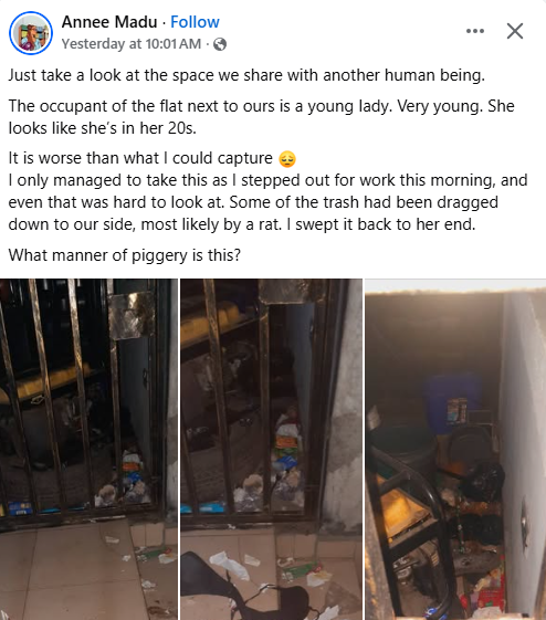 A Nigerian lady, Annee Madu, has shared photos showing the filthy and unhygienic condition of her next-door neighbor’s apartment. Just take a look at the space we share with another human being. The occupant of the flat next to ours is a young lady. Very young. She looks like shes in her 20s, she wrote in a Facebook post on Tuesday, February 10, 2026. It is worse than what I could capture. I only managed to take this as I stepped out for work this morning, and even that was hard to look at. Some of the trash had been dragged down to our side, most likely by a rat. I swept it back to her end. What manner of piggery is this?  The post What manner of piggery is this? Nigerian lady exposes her next-door neighbour’s filthy apartment appeared first on Linda Ikeji Blog.