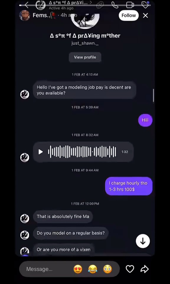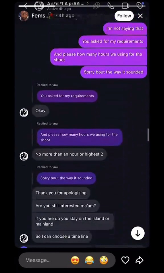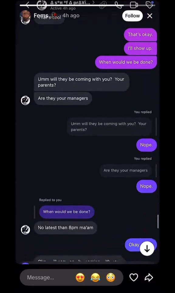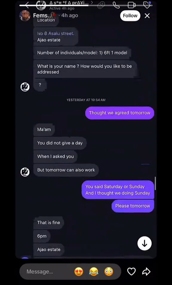 The chat between a content creator and a man who allegedly r@ped her and her friend after offering a fake modelling job has been revealed. In the chat, the man, who goes by The Son of a Praying Mother, is seen speaking to her about a job, asking for her fee and other requirements, and vowing that he can’t cheat her. The man sounded professional in the chat, up until when the lady expressed concern about the time he chose for the shoot. When the woman complained about the late hour, he asked if she was a minor and if her parents would be coming with her. He claimed he doesn’t work with minors and told her he was asking these questions for her safety. The content creator explained that she has a curfew, then he assured her that the shoot would be done in 2 hours.