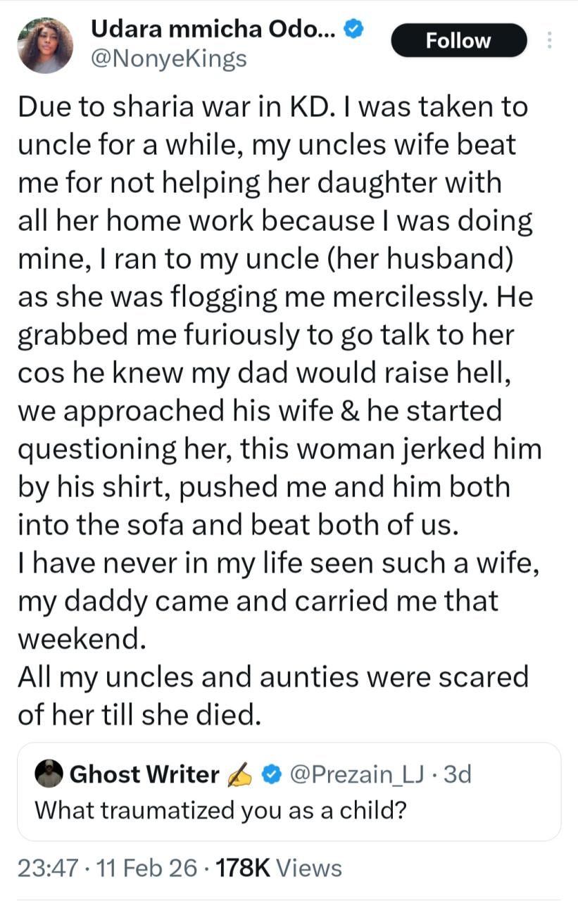 A woman has shared a traumatising experience from her childhood that she will never forget. She narrated how her parents sent her to stay with her uncle and his wife to protect her during a religious crisis in Kaduna. She went on to narrate how her aunt was flogging her one day for not helping their child with homework. When she ran to her uncle and he intervened, she said the aunt also abused her husband in her presence for interfering. She recalled: “Due to sharia war in KD. I was taken to uncle for a while, my uncle’s wife beat me for not helping her daughter with all her home work because I was doing mine, I ran to my uncle (her husband) as she was flogging me mercilessly. “He grabbed me furiously to go talk to her cos he knew my dad would raise hell, we approached his wife & he started questioning her, this woman jerked him by his shirt, pushed me and him both into the sofa and beat both of us. “I have never in my life seen such a wife, my daddy came and carried me that weekend. All my uncles and aunties were scared of her till she did.