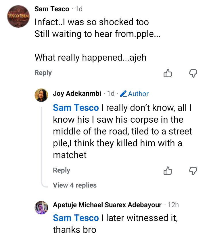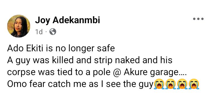 An unidentified man was found d3ad near Tosin Alukos Garage along Ajilosun Road in Ado-Ekiti, the Ekiti State capital. The discovery was made in the early hours of Thursday, February 12, 2026 when residents noticed a lifeless body lying by the roadside. Eyewitnesses said the deceased was str!pped n@k3d, bound and tied to a pole. An eyewitness said that the man might have been b3aten to d3ath. Operatives of the Ekiti State Police Command later arrived at the scene, cordoned off the area and evacuated the body in a patrol vehicle for preliminary investigation. The police has not yet issued an official statement on the identity of the deceased or the cause of d3ath.