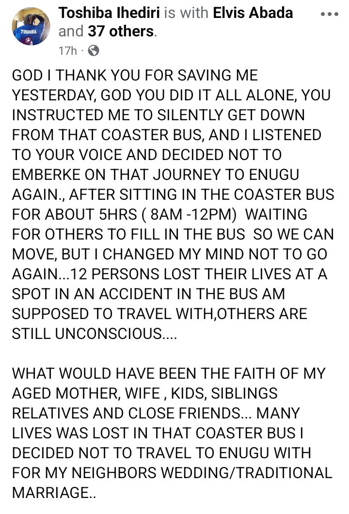 A Nigerian man, Toshiba Ihediri, has expressed appreciation to God for saving him from a road crash that claimed the lives of 15 Umuahia traders.  The victim d!ed in the crash on their way back from a traditional marriage in Enugu state on Sunday, February 15, 2026.  Ihediri, who is the groom’s neighbour, said he alighted from the bus after waiting for 5 hours for it to fill up. According to him, God instructed him to get down from the bus and he decided not to embark on that journey.  God, I thank You for saving me yesterday. God, You did it all alone, he wrote. You instructed me to silently get down from that coaster bus, and I listened to Your voice and decided not to embark on that journey to Enugu again. After sitting in the coaster bus for about 5 hours (8am12pm), waiting for others to fill the bus so we could move, I changed my mind and decided not to go again. Twelve persons lost their lives at a spot in an accident involving the bus I was supposed to travel with. Others are still unconscious. What would have been the fate of my aged mother, wife, kids, siblings, relatives, and close friends?  Many lives were lost in that coaster bus. I decided not to travel to Enugu for my neighbors wedding/traditional marriage. Who am I to gain such a favor from You? I was the only person who changed my mind and decided not to travel with that coaster bus. Thank You, Lord, for You have shown me mercy. I am so grateful to You and will always remain grateful. The post God instructed me to get down from the bus – Man shares testimony after road crash claims lives of 15 Umuahia traders returning from a wedding appeared first on Linda Ikeji Blog.