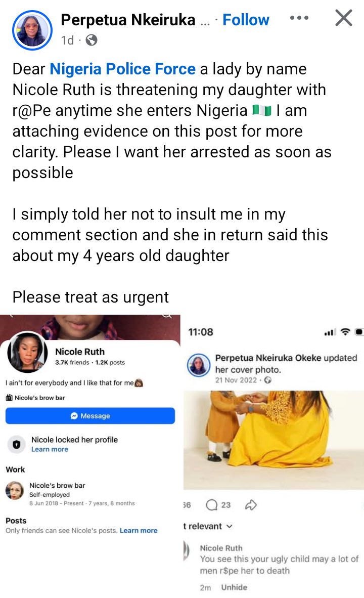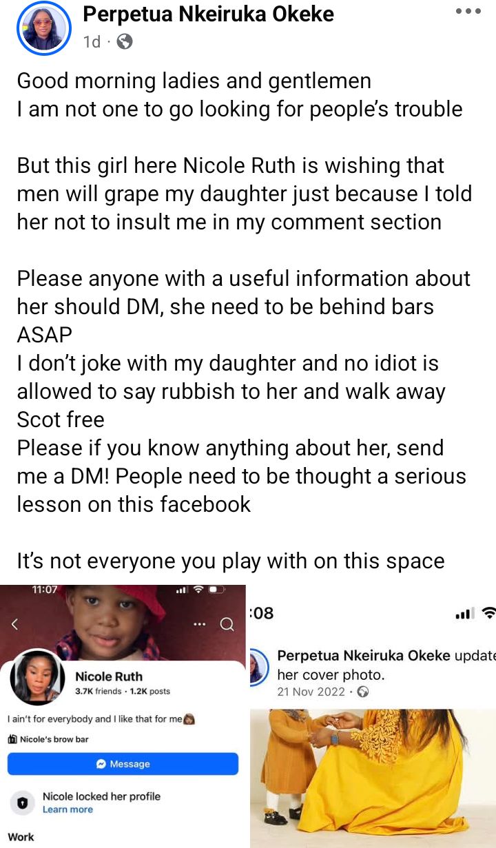 A Nigerian lady, Perpetua Nkeiruka Okeke, has exposed one Nicole Ruth, who allegedly commented on her daughter’s photo calling the child ug*l and wishing men will r@p3 her. According to Perpetua, it all stared after she told the lady to quit insulting her in her comment section. “Good morning ladies and gentlemen. I am not one to go looking for peoples trouble. But this girl here @Nicole Ruth is wishing that men will grape my daughter just because I told her not to insult me in my comment section. Please anyone with a useful information about her should DM, she need to be behind bars ASAP,” she wrote in a Facebook post on Sunday, February 15, 2026. I dont joke with my daughter and no idiot is allowed to say rubbish to her and walk away Scot free. Please if you know anything about her, send me a DM! People need to be thought a serious lesson on this facebook. Its everyone you play with on this space.
