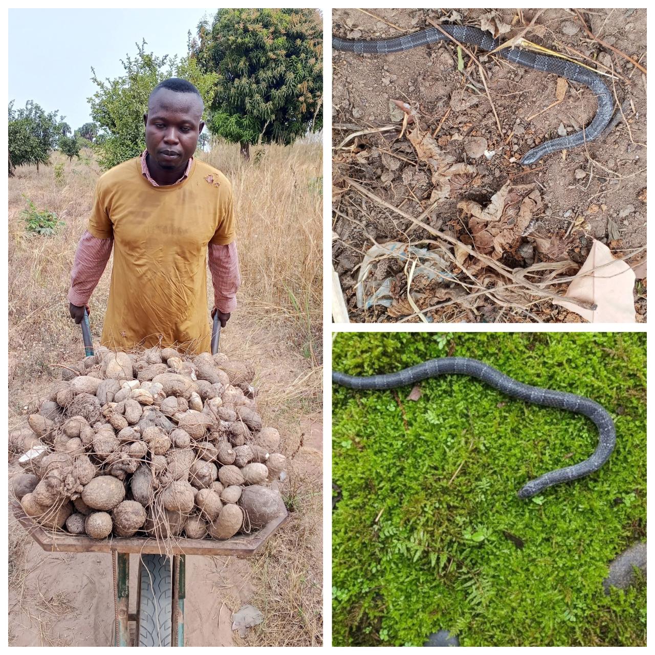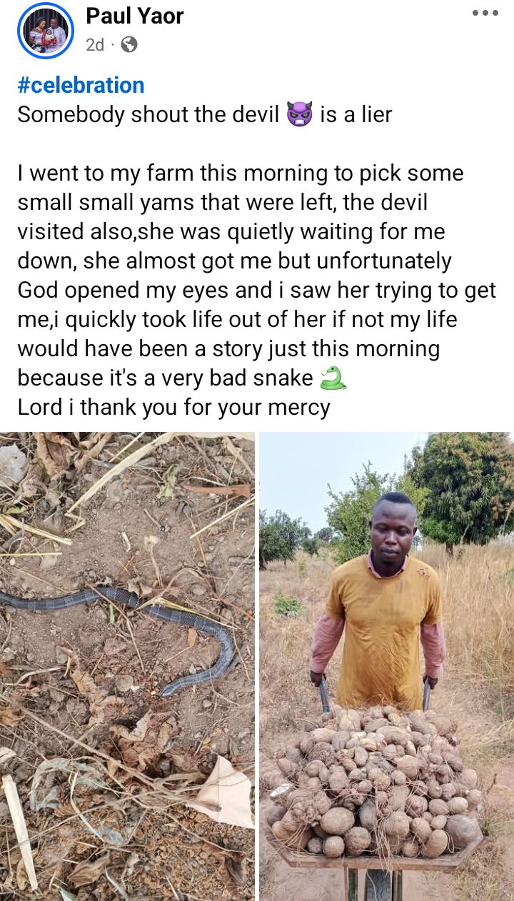 A Nigerian man, Paul Yaor, has expressed his gratitude to God after he narrowly escaped a snake bite on his farm. According to Paul, he had gone to to farm on Saturday to harvest yam and found the poisonous snake lurking and waiting to attack. #celebration. Somebody shout the devil is a liar. I went to my farm this morning to pick some small small yams that were left. The devil visited also, she was quietly waiting for me down. She almost got me but unfortunately God opened my eyes and I saw her trying to get me. I quickly took life out of her if not my life would have been a story just this morning because it’s a very bad snake. Lord I thank you for your mercy.”