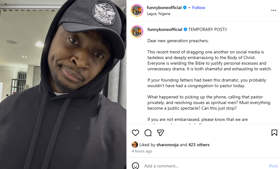 Comedian Chibunna Stanley aka Funnybone has called out New Generation clergymen who have formed the habit of calling out their colleagues online. In a post shared on Instagram today, Funnybone said their actions is both shameful and exhausting to watch. He wondered why clergymen cannot pick their phones and call to address any issue they may have with their colleagues. He added that if they are not ashamed, they should know that other Christians are ashamed on their behalf. He wrote;Dear new generation preachers, This recent trend of dragging one another on social media is tasteless and deeply embarrassing to the Body of Christ. Everyone is wielding the Bible to justify personal excesses and unnecessary drama. It is both shameful and exhausting to watch. If your founding fathers had been this dramatic, you probably wouldnt have had a congregation to pastor today. What happened to picking up the phone, calling that pastor privately, and resolving issues as spiritual men? Must everything become a public spectacle? Can this just stop? If you are not embarrassed, please know that we are embarrassed on your behalf. Pastors behaving like content creators online sigh”