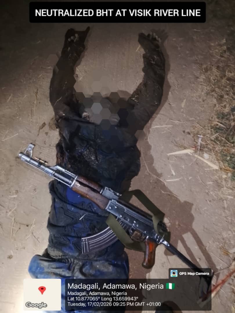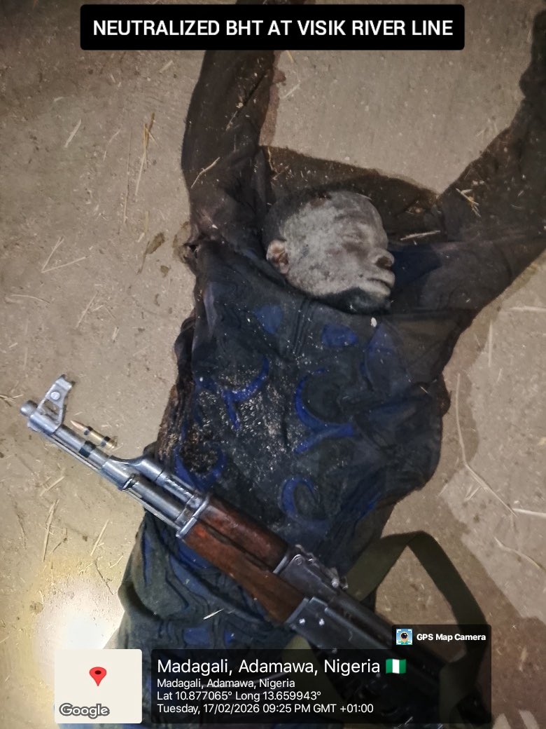 Troops of Operation HADIN KAI in coordination with local vigilantes and hunters, have neutralised a top Boko Haram commander and arrested a suspected drone and logistics supplier in separate operations in Madagali Local Government Area of Adamawa State. Troops at about 5:30 p.m. on Thursday, February 19, 2026, engaged suspected Boko Haram fighters at an ambush along the Visik River line, resulting in the neutralisation of one terrorist identified as Abdullahi Mafa, a former hybrid commander in Madagali. In a subsequent raid at Madagali Motor Park around 6:30 p.m., the troops arrested 64-year-old Dauda Usman Gubula, a suspected Boko Haram collaborator and drone supplier. Items recovered from the suspect included two aerial drones and 20 solar power banks. The suspect is currently in custody undergoing investigation, while troops continue to intensify operations aimed at dismantling Boko Haram networks and restoring security in the region.