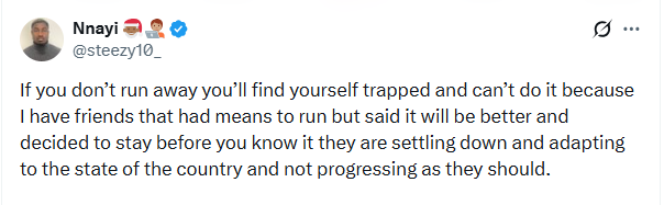 A Nigerian man, Nnayi, has revealed his impressive transformation after relocating to Ireland and advised the youths to seek greener pastures abroad. The cyber security expert took to X on Thursday, February 19, 2026 to share his current photo alongside one taken while he was in Nigeria. Reflecting on his journey, Nnayi said he would have ended up as a labourer or worse if he had stayed back, believing that Nigeria will get better. Our parents said Nigeria will get better, so they were told and now we have youths thinking the same. Well I didnt do that. I went to find greener pastures and decided to love Nigeria from the diaspora. If I didnt do that I might have been stuck as a labourer or even worse. Better move now, he wrote. “If you dont run away youll find yourself trapped and cant do it because I have friends that had means to run but said it will be better and decided to stay before you know it they are settling down and adapting to the state of the country and not progressing as they should. Dont let that be your case make a difference for your life. Thats all I can advise.