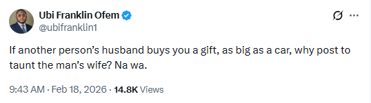 Music executive, Ubi Franklin, has taken to social media to query a side chic who chose to flaunt a car gift received from a married man, Without mentioning the said side chic’s name, Ubi wroteIf another persons husband buys you a gift, as big as a car, why post to taunt the mans wife? Na wa.”