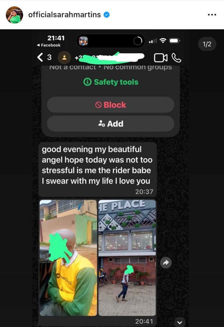 Actress Sarah Martins lashed out at a delivery man who sent her a message to profess his love after delivering a package to her. Apparently, the delivery man was contracted to deliver an item to Sarah. After making the delivery, he later sent a message to her, telling her that he is in love with her.Good evening my beautiful angel. Hope your day was not too stressful? It’s me the ride babe. I swear with my life I love you”Upon receiving the message, Sarah immediately responded, expressing her disgust at it. She told him that it appears he doesn’t love his job anymore. Moments later, the rider responded claiming he has lost his job just because he professed his love to her.