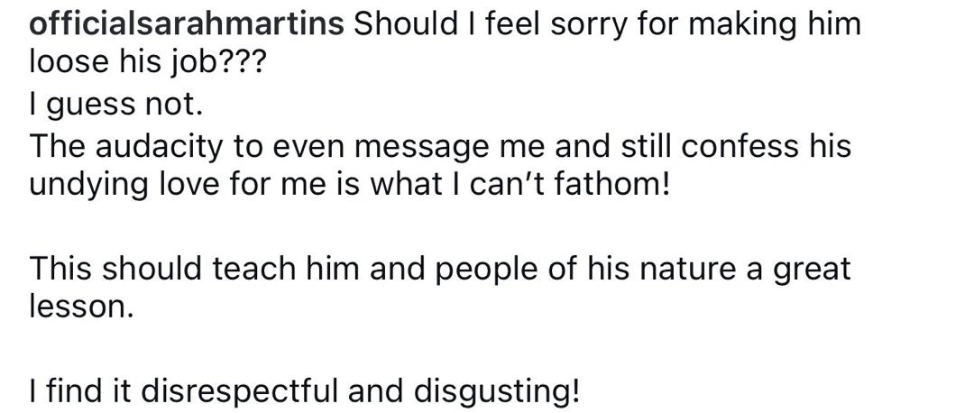 Actress Sarah Martins lashed out at a delivery man who sent her a message to profess his love after delivering a package to her. Apparently, the delivery man was contracted to deliver an item to Sarah. After making the delivery, he later sent a message to her, telling her that he is in love with her.Good evening my beautiful angel. Hope your day was not too stressful? It’s me the ride babe. I swear with my life I love you”Upon receiving the message, Sarah immediately responded, expressing her disgust at it. She told him that it appears he doesn’t love his job anymore. Moments later, the rider responded claiming he has lost his job just because he professed his love to her.